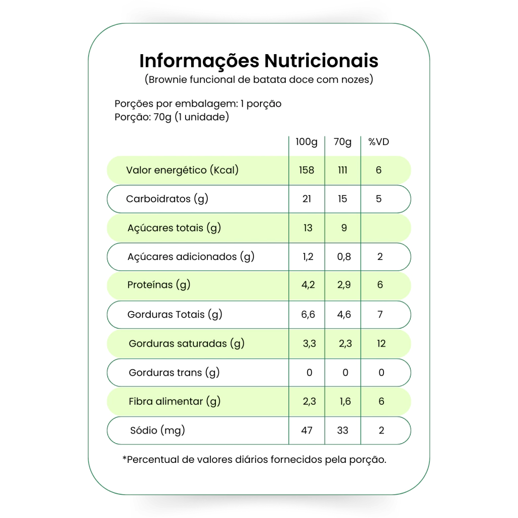 Brownie funcional de batata doce com nozes quebrada e castanha do pará quebrada que incorpora o melhor do chocolate 70% em cacau, com textura macia por dentro e crocante por fora.