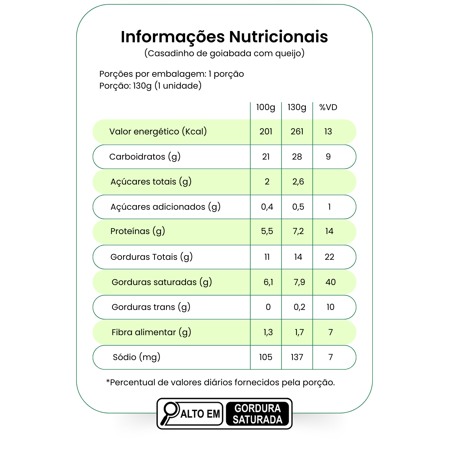 INGREDIENTES: Leite integral, creme culinário, leite em pó, chocolate branco zero açúcar, goiabada zero açúcar, queijo mussarela, estévia, emustab e pectina.
