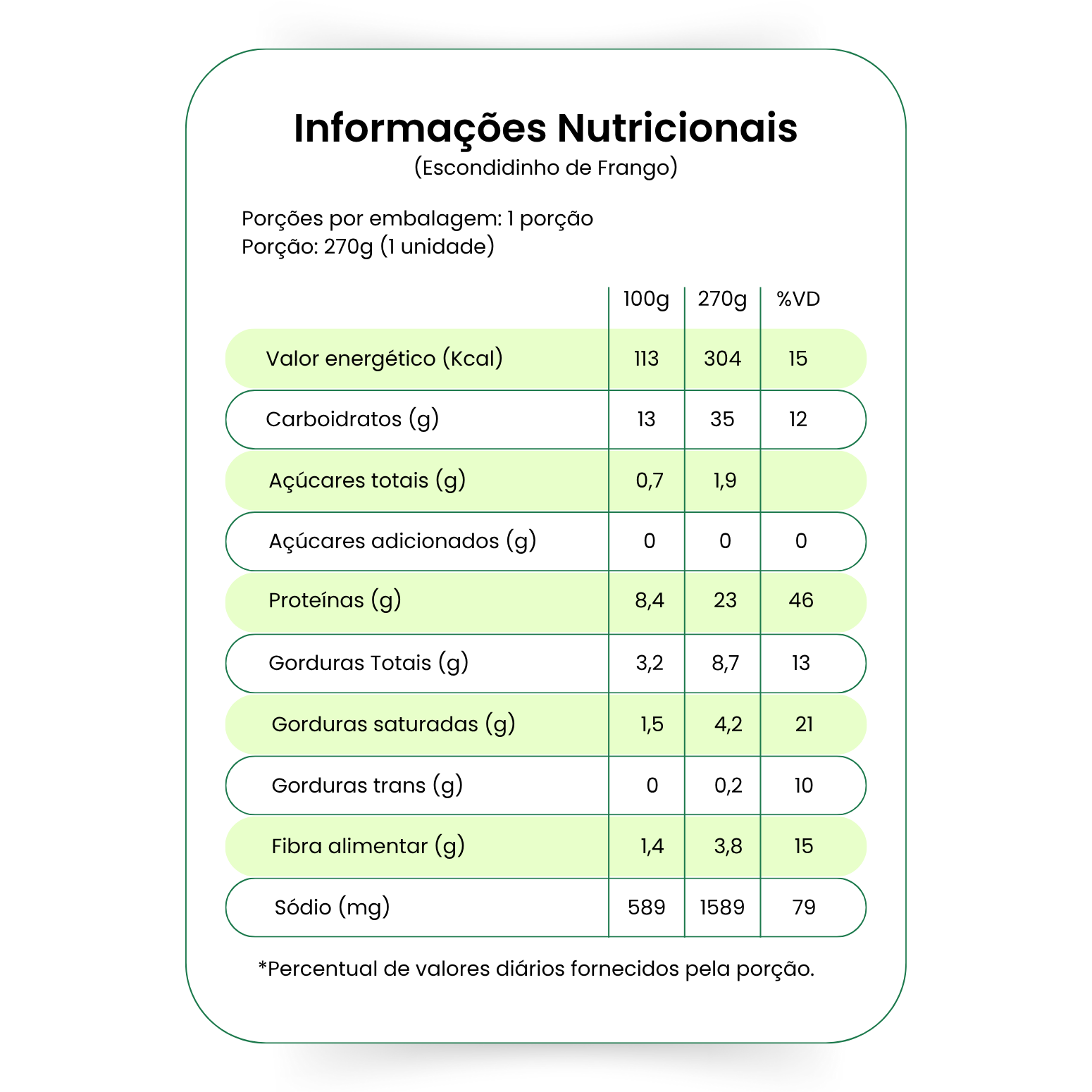 Alimentação saudável e prática para sua rotina! Nosso escondidinho de frango é feito com peito de frango desfiado e molho de tomate cuidadosamente preparado e temperado. Combinação perfeita de proteína magra com purê de batatas cremoso. Refeição congelada balanceada, pronta em minutos, ideal para quem busca praticidade sem abrir mão da qualidade. Perfeito para dieta equilibrada ou quem tem rotina corrida. Sabor de comida caseira sempre disponível!