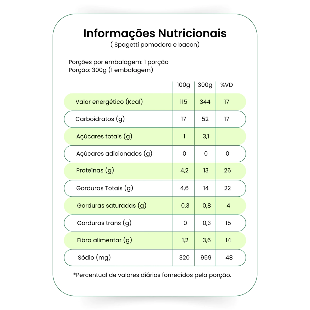 Combo com 24 refeições FAST (300g cada) de Espaguete ao Molho Pomodoro com Bacon, uma massa leve, saborosa e perfeita para o dia a dia.