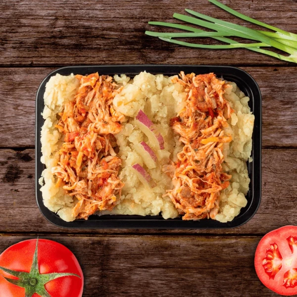 INGREDIENTES: Batata doce, tomate, filé de peito de frango desfiado, cebola, molho de tomate, sal, salsinha, colorau, alho, açafrão em pó, páprica defumada, alho em pó, cebola em pó, salsinha desidratada, orégano, tomilho desidratado e alecrim seco.